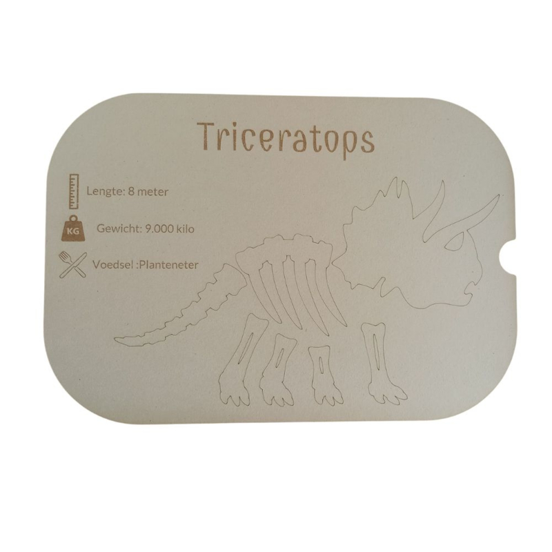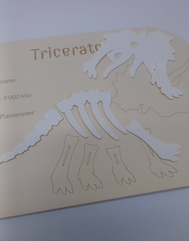 Verstop de botten in speelzand, kinetisch zand of speelrijst en laat kinderen op zoek gaan naar de fossielen. Tijdens het spelen ontdekken ze hoe een Triceratops eruitzag en waar de botten horen. Zo ontstaat een speelse combinatie van ontdekken, zoeken en bouwen.