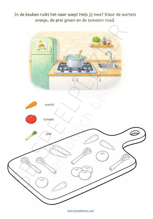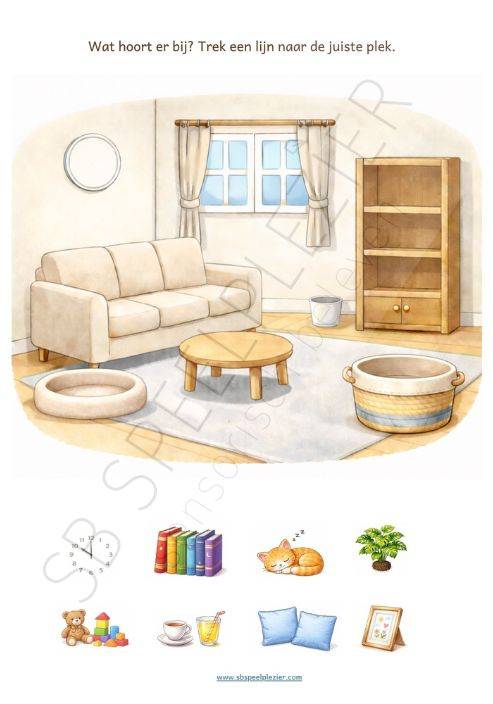 Rond elke ruimte in huis zijn werkbladen uitgewerkt, zoals de hal, woonkamer, slaapkamer, keuken en meer. Zo leren kinderen hun eigen leefomgeving herkennen én benoemen.
