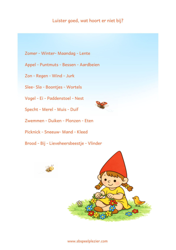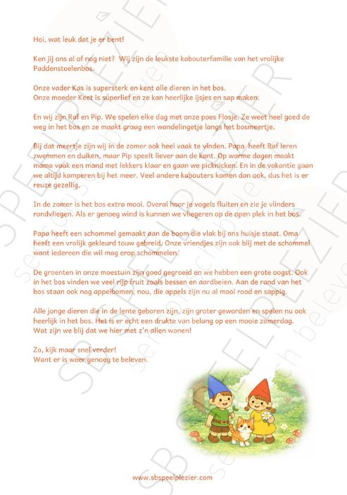 Een zonnige themabundel met kabouters in de hoofdrol, vol speelse en leerzame werkbladen voor jonge kinderen. In deze PDF vind je afwisselende opdrachten zoals zoeken, verbinden, tekenen, tellen en ontdekken en zelfs een kaboutermemory, allemaal in een herkenbare zomerse sfeer. De vormgeving is rustig en overzichtelijk, zodat kinderen zelfstandig of samen aan de slag kunnen. De bundel start met een kort verhaal dat aansluit bij het thema en eindigt met tips voor het maken van een sensorische speelbak in kabouter-zomerthema.
