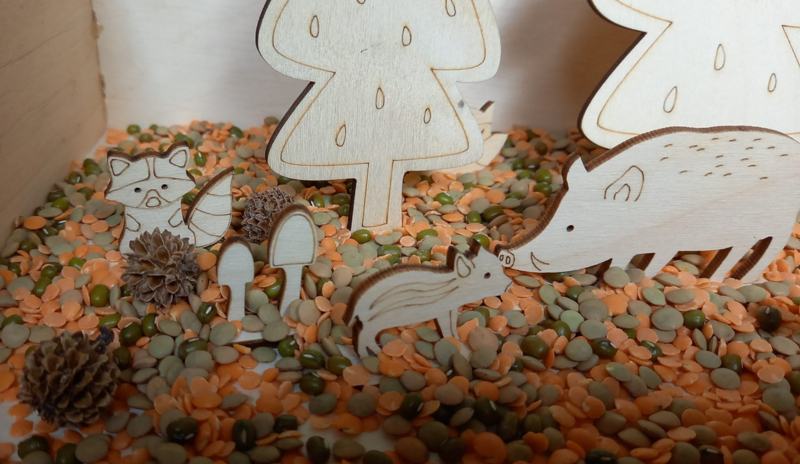 De speelset bevat onder andere diverse sensorische materialen zoals een mix van mungbonen en linzen, houten speelfiguren,  en nog veel meer.