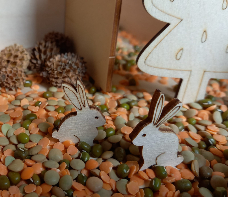 Een mix van linzen en mungbonen matchen qua kleur heel mooi voor het herfstthema! In de winter kun je het thema aanvullen met winterse materialen.