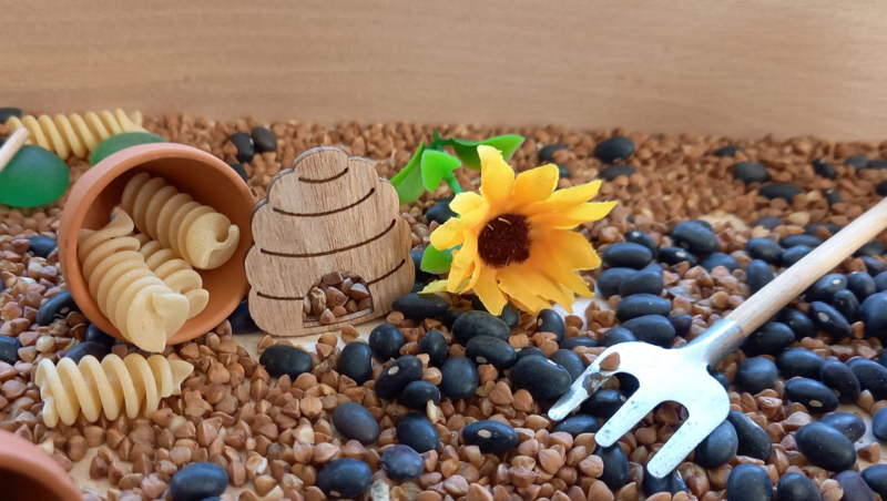 De basis is een mix van zwarte bonen en boekweit. Dit is een hele mooie sensorische mix, de bonen zijn glad en kunnen ook heel makkelijk gesorteerd worden. De boekweit heeft een hoekig structuur en geeft daardoor weer een totaal andere textuurbeleving voor je kindje.