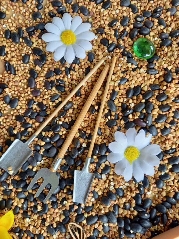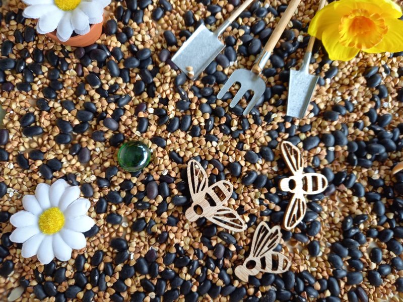 De basis is een mix van zwarte bonen en boekweit. Dit is een hele mooie sensorische mix, de bonen zijn glad en kunnen ook heel makkelijk gesorteerd worden. De boekweit heeft een hoekig structuur en geeft daardoor weer een totaal andere textuurbeleving voor je kindje. Als je wilt kun je de set ook zonder bonen/boekweitmix bestellen.